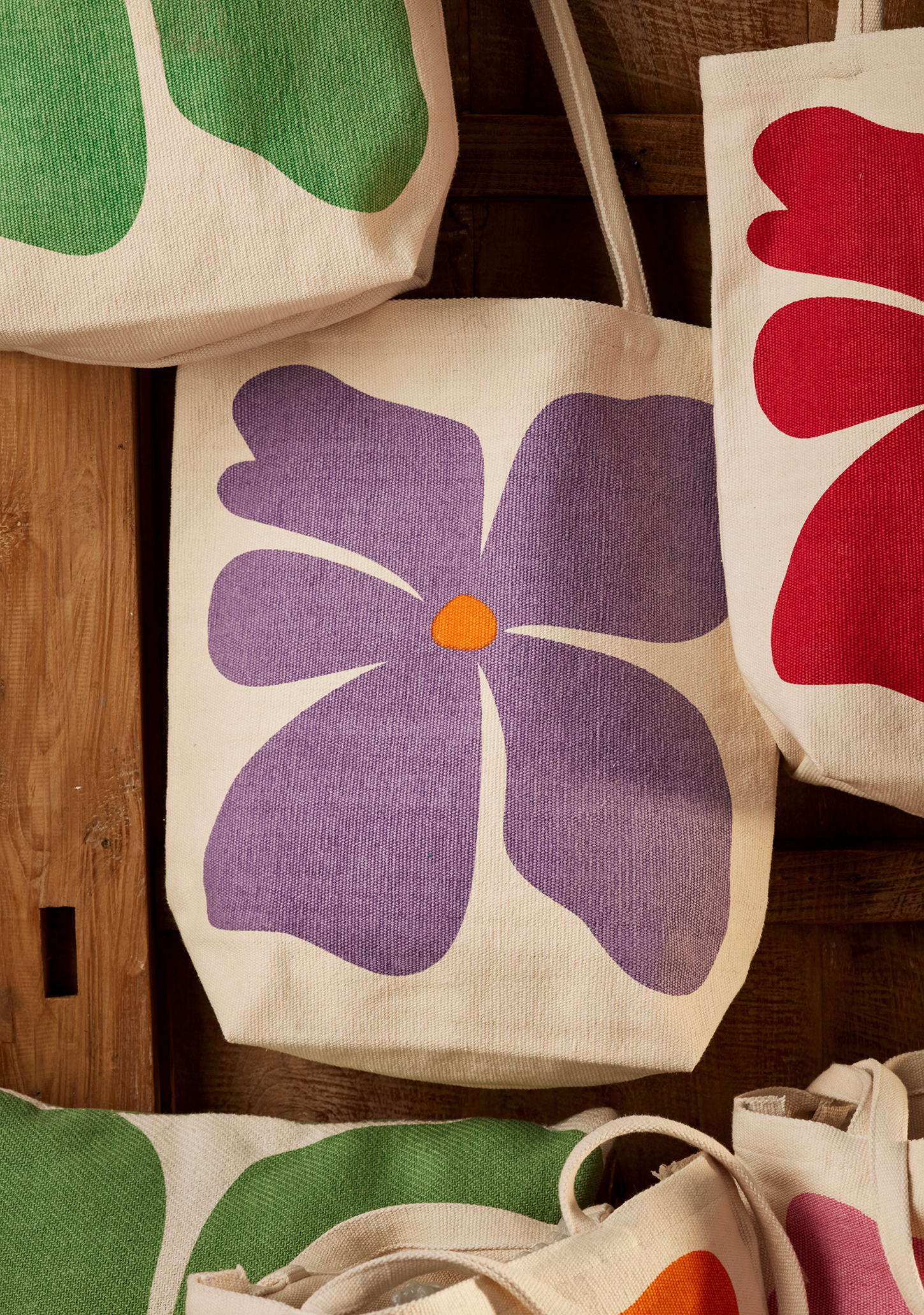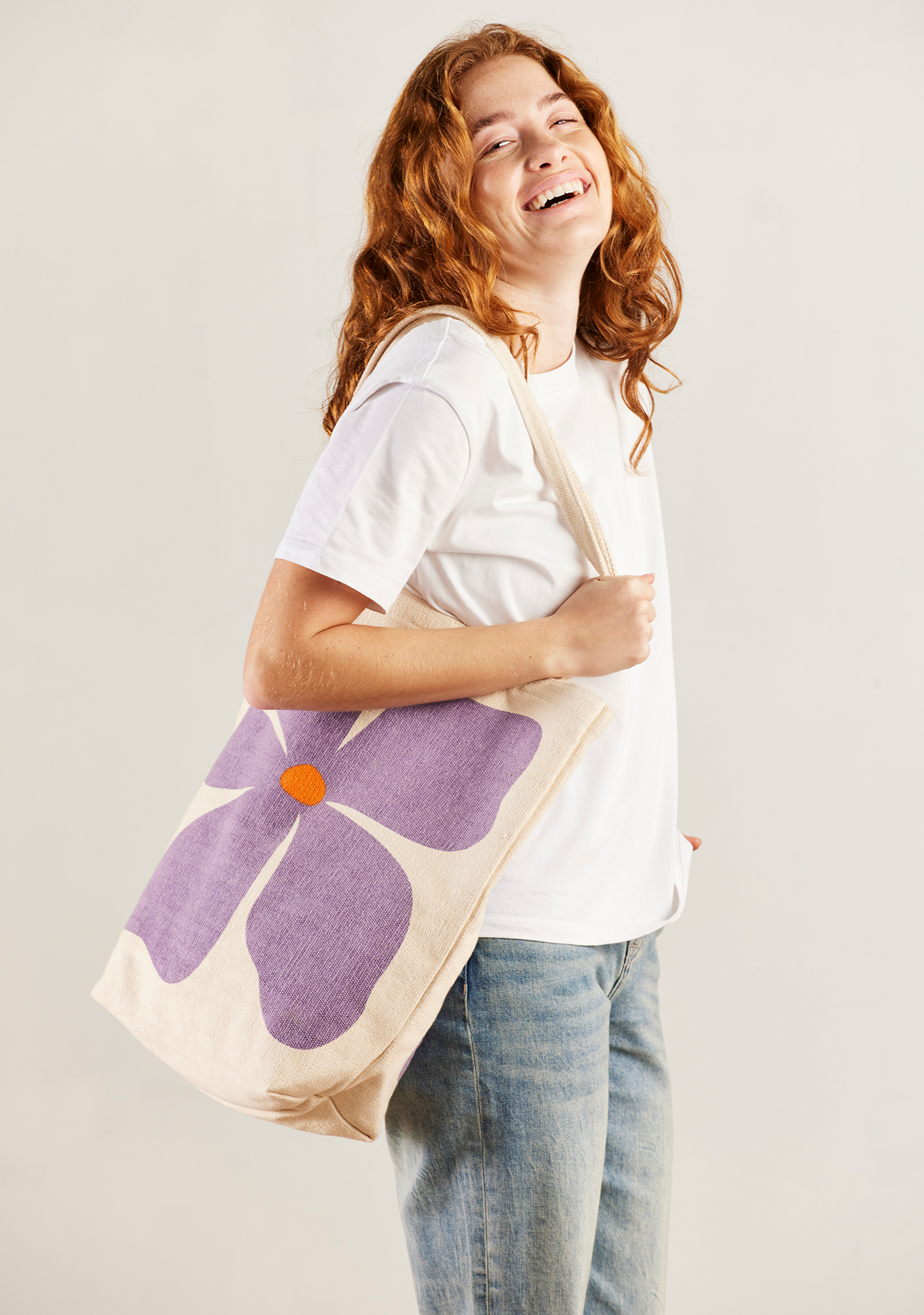 This bold and practical tote bag is made from 100% recycled cotton, incorporating screen-printed design and strong cotton handles. Featuring a vivid purple flower design on both sides, this tote bag is your go-to for lightweight day-to-day use.